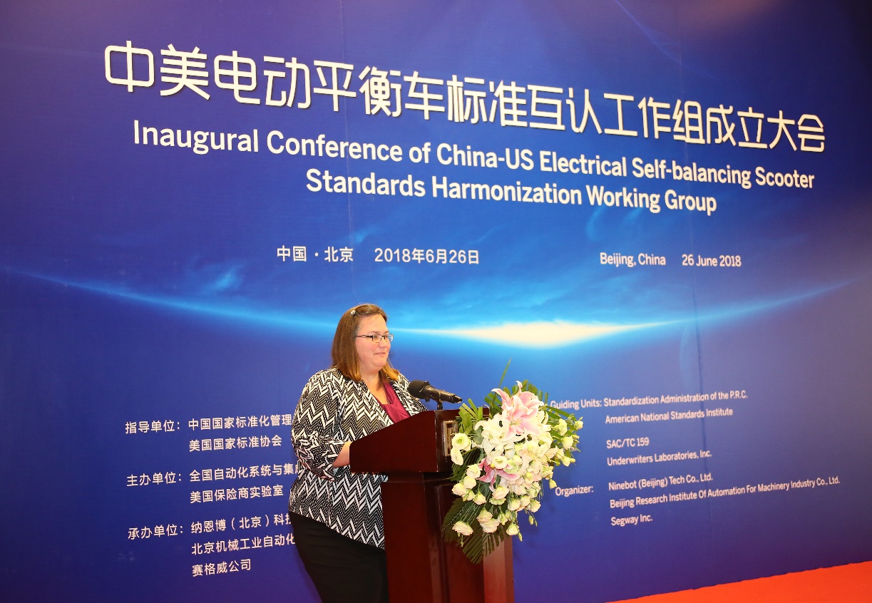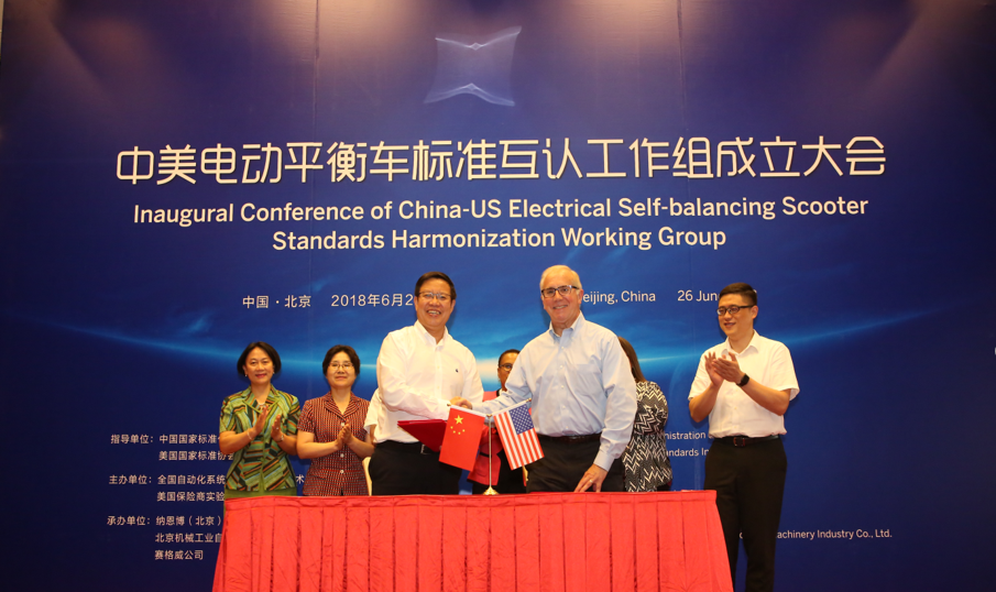 6月26日,中美電動平衡車標準互認工作組成立大會在北京唯實大廈成功舉行。全國自動化系統與集成標準化技術委員會主任委員、機械總院集團董事長王德成與美國保險商實驗室全球副總裁 Philip M.Piqueira分別代表中美雙方簽署電動平衡車標準互認合作協議。中國國家標準化管理委員會副主任殷明漢、IEC美國國家委員會副主席Sonya Bird、美國大使館參贊Cynthia Griffin、北京航空航天大學教授王田苗、全國自動化系統與集成標準化技術委員會秘書長黎曉東、Segway-Ninebot公司總裁王野等領導及電動平衡車國家標準起草組專家出席會議,共同見證了中美兩國標準化合作的歷史時刻。